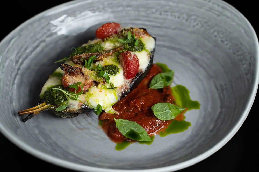 Запеченая половина баклажана с томатным и песто соусом, мацареллой и грано понано.
