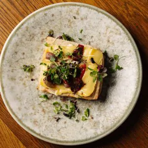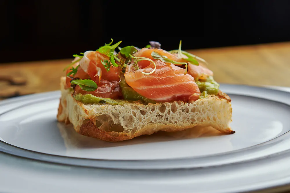 Римское тесто, гуакамоле, слабосоленый лосось, фенхель, украшается микс салатом