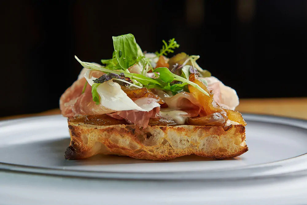Римское тесто, фламбированная груша, парма, соус с горгонзолой, украшается микс салатом.