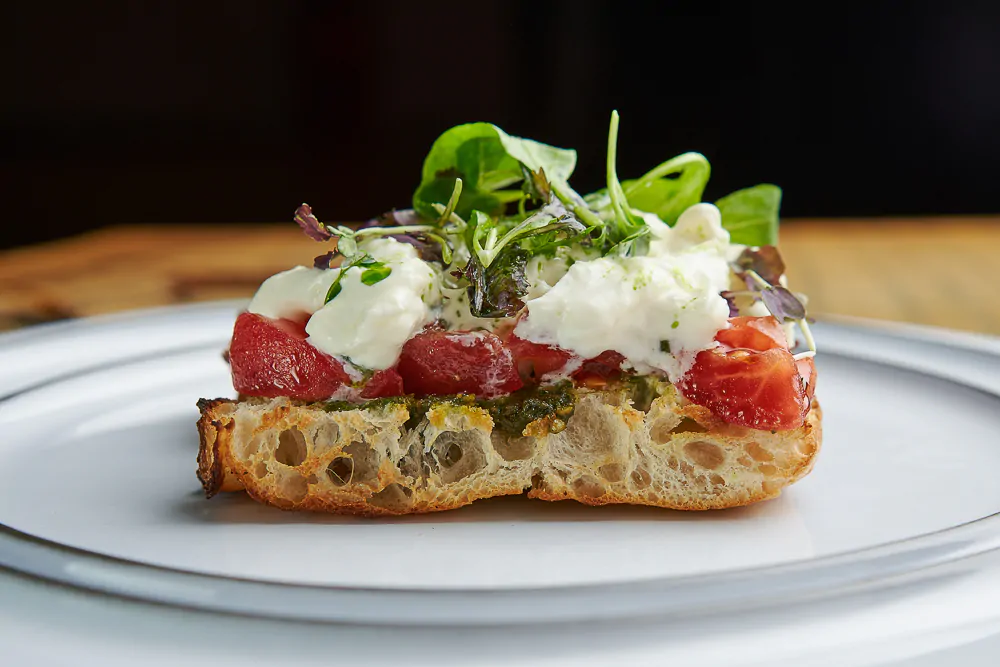 Римское тесто, соус песто, узбекские томаты, страчателла, украшается микс салатом