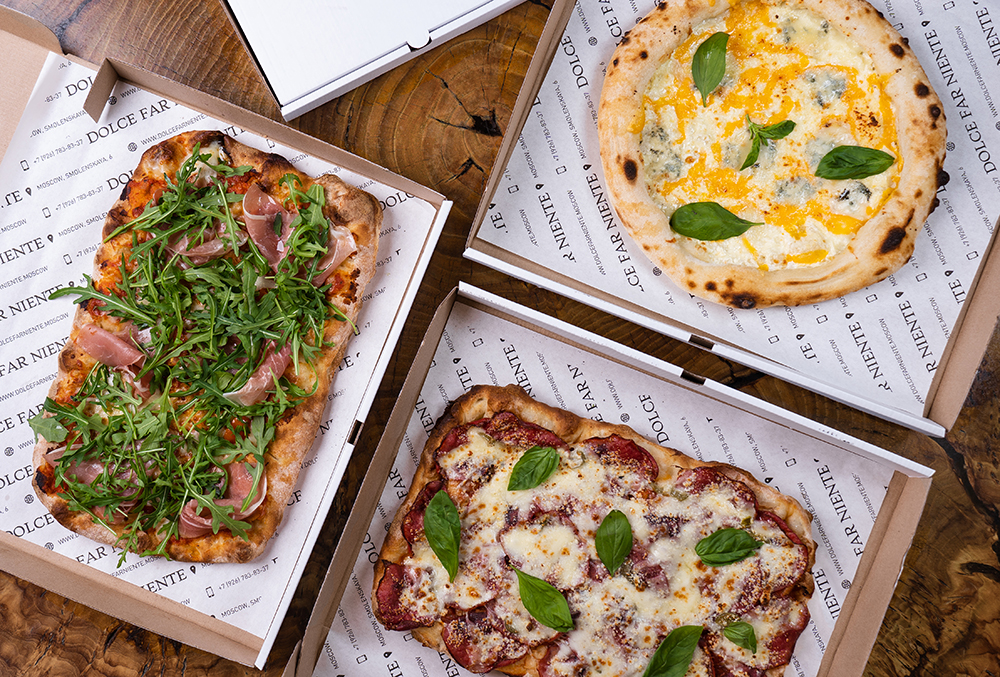 Карпаччо из говядины с луком римская- 35*25, кватро формаджи – неаполитанская, прошутто с рукколой римская – 35*25