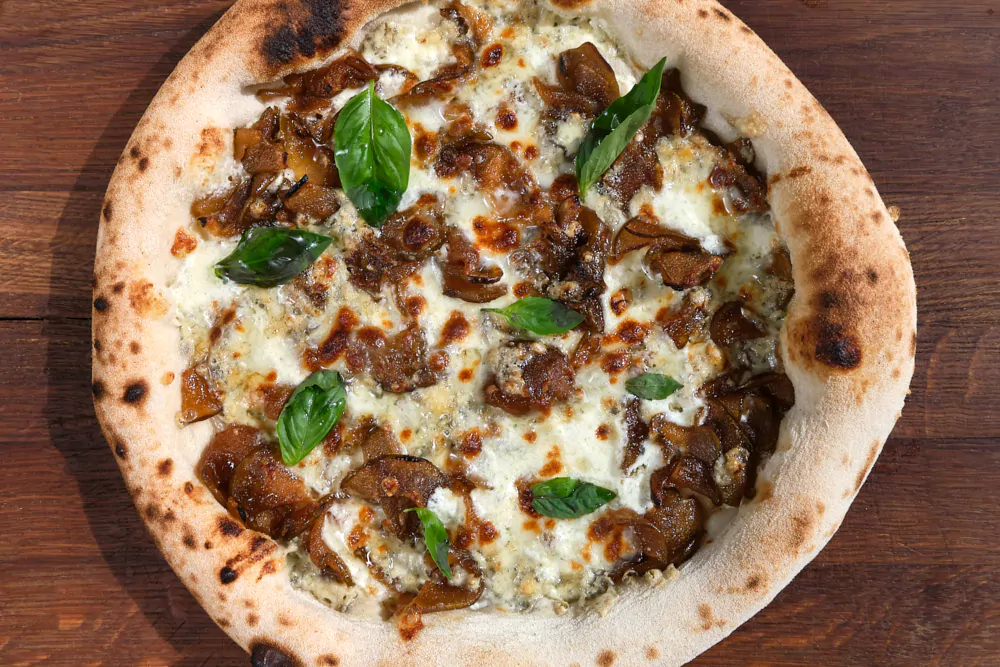 Тесто, сливочный соус (маскарпоне, сливки), горгонзола, груша фламбированная (груша, масло сливочное, сахар), базилик, оливковое масло (28 см)