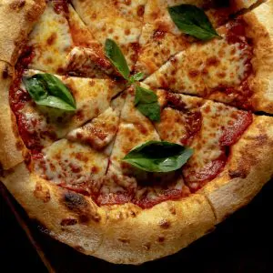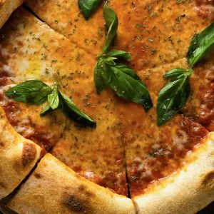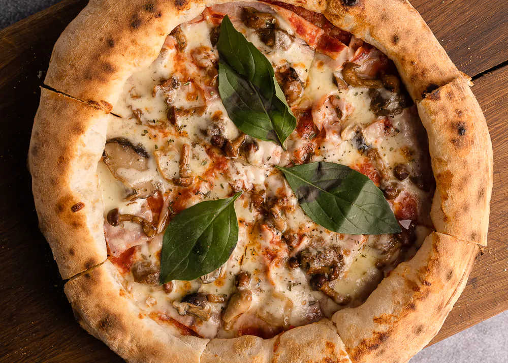 Тесто, соус томатный (томаты в собственном соку, сахар, масло оливковое, базилик), моцарелла, ветчина, грибы лесные (белые, опята), артишоки, пармезан, базилик, оливковое масло (28 см)