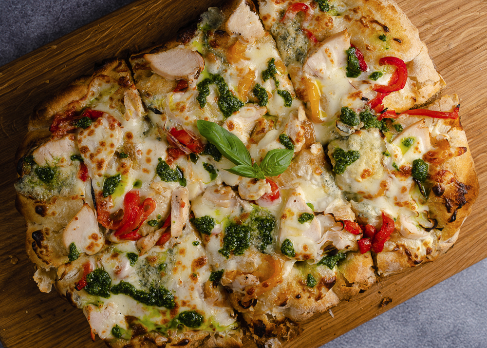 Пицца на сливочном соусе с домашним песто, камабером, курицей, сладким перцем и красным луком