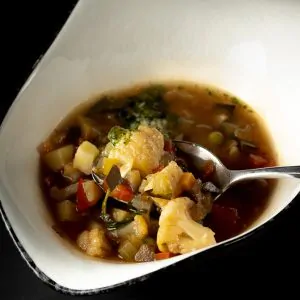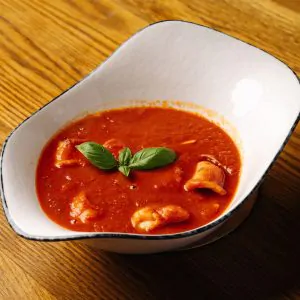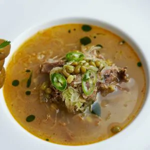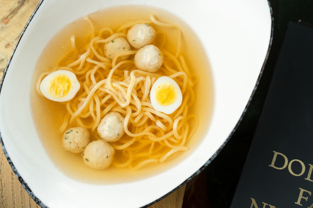 Куриный бульон, фрикадельки, паста из твердых сортов пшеницы, перепелиное яйцо, зеленое масло.