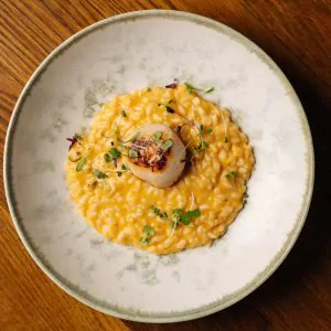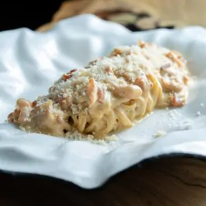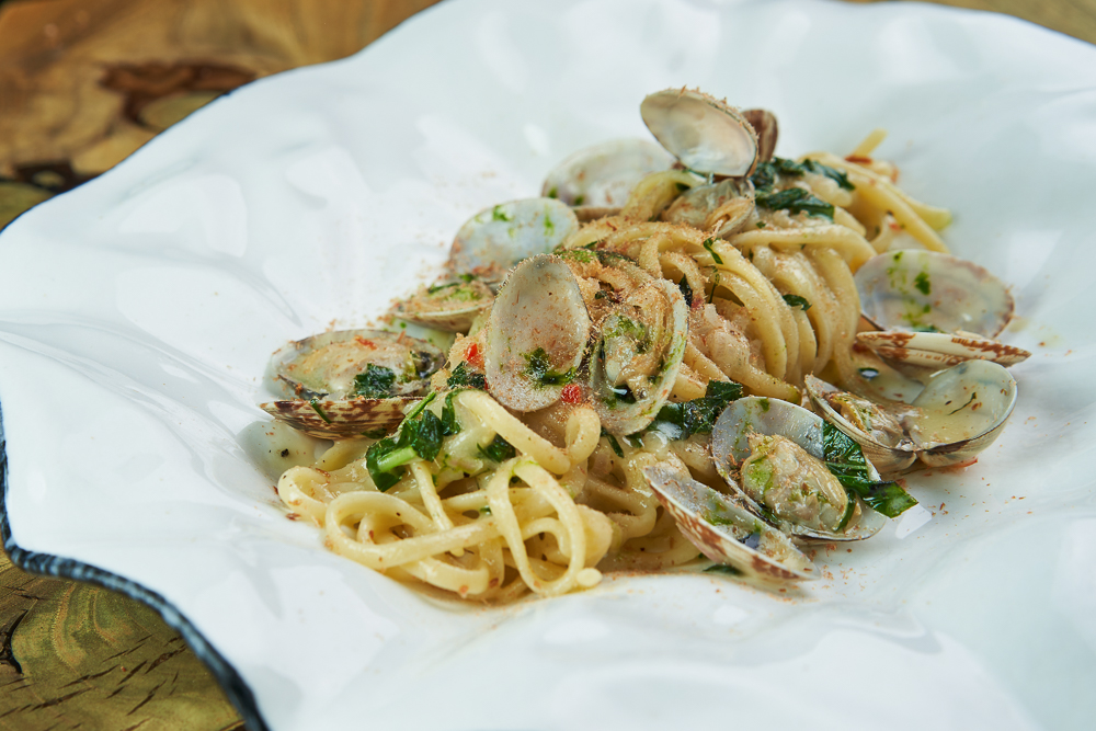 Паста лингвини с вонголе в соусе из белого вина, сливочного масла, чеснока и базилика. Сверху украшается сушеной пармой, натертой на мелкой терке.