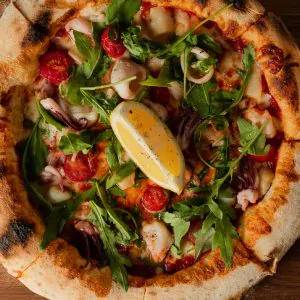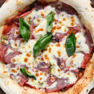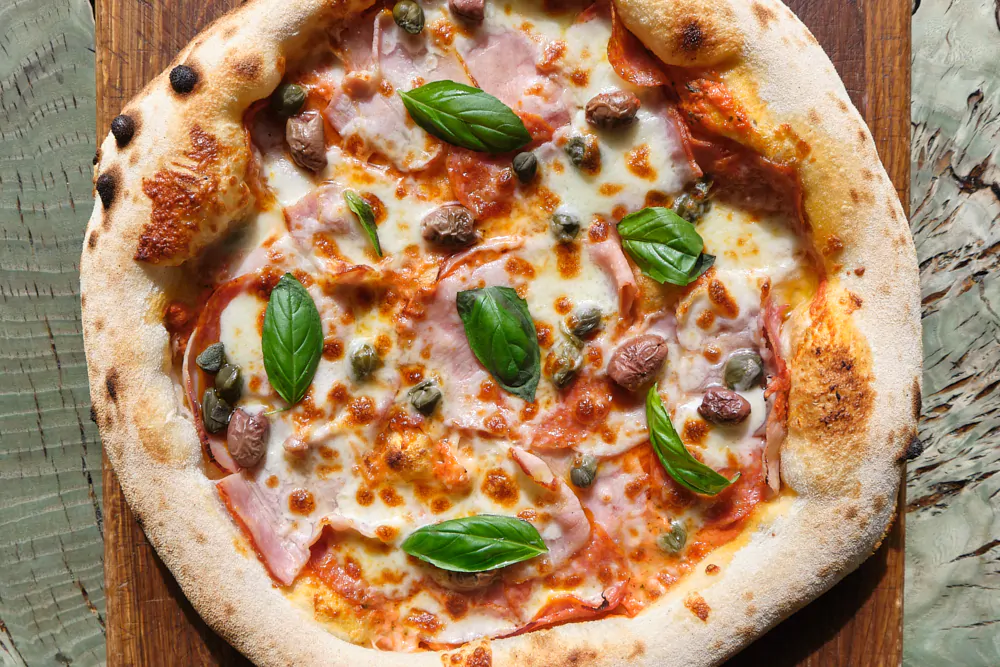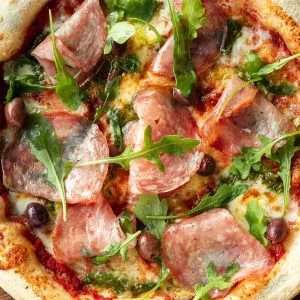 Томатный соус, сливочный соус, ветчина, колбаса пепперони, бекон, каперсы, оливки, моцарелла, пармезан (28 см)
