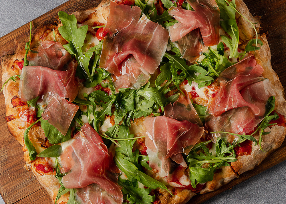 Томатный соус, помидоры черри, сыр моцарелла, рукола и пармская ветчина.