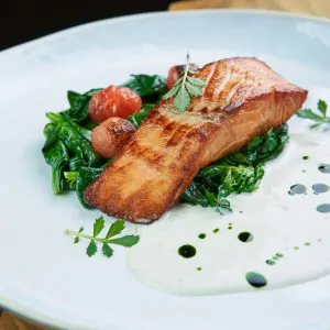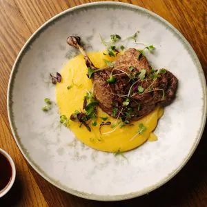 Свиная карейка зачищенная и маринованная в пряном тузлуке. Запонированна в сухарях с базиликом и копченой паприкой, обжаривается во фритюре и доводится в пароконвектомате. Подается с острым томатным соусом на базе кимчи, со свежими томатами и яблоком.
