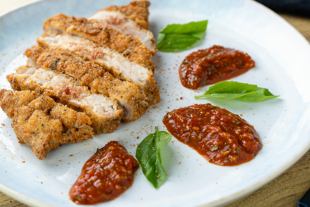 Свиная карейка зачищенная и маринованная в пряном тузлуке. Запонированна в сухарях с базиликом и копченой паприкой, обжаривается во фритюре и доводится в пароконвектомате. Подается с острым томатным соусом на базе кимчи, со свежими томатами и яблоком.