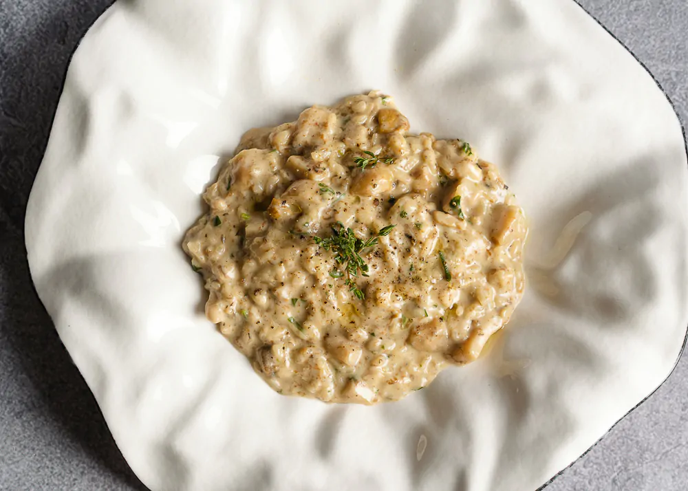 Рис карнароли, соль, перец, чеснок, петрушка, трюфельная паста, сыр дорблю, масло оливковое, масло сливочное, грибы белые, бульон, базилик