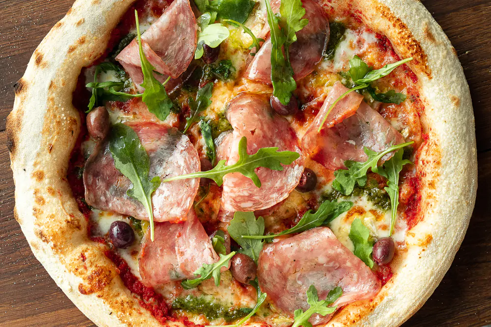 Томатный соус, моцарелла, камамбер, салями, песто, тесто (28 см)