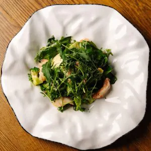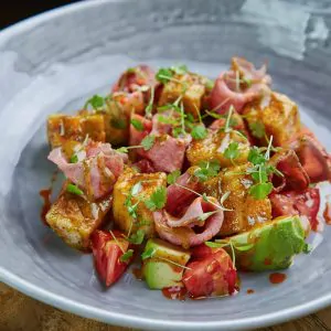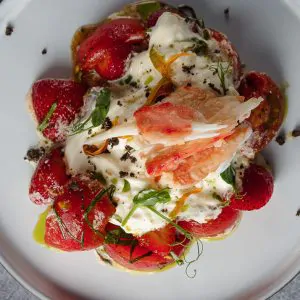 Томаты, страчателла, клубника, зеленое масло, крем бальзамик