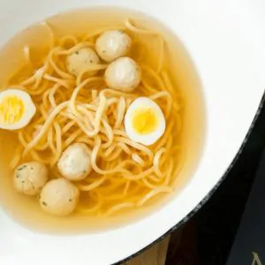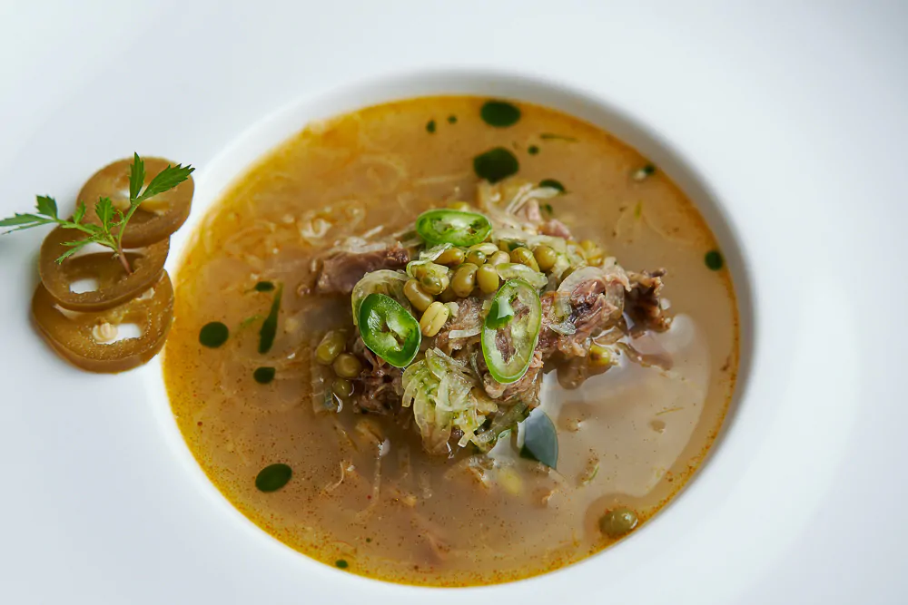 Бульон из запеченых бычьих хвостов с луком шалот томленым в белом вине с тимьяном, машем, чили перцем и мясом с хвостов